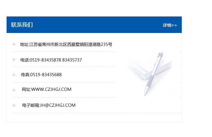 傳真:0519-83435688    郵編:213135    網址:WWW.czjhgj_com.lcjingde.com    電子郵箱:JH@czjhgj_com.lcjingde.com